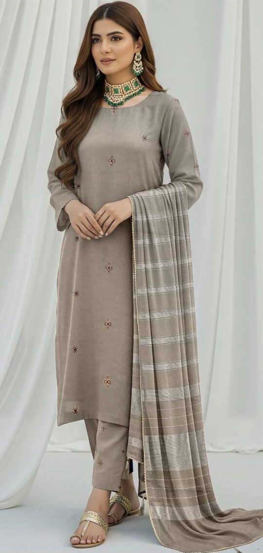 Be the first to review “Taupe Embroidered Stitched Suit with Stripped Dupatta”
